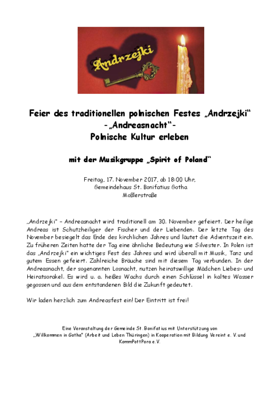 Die Andreasnacht, polnisch Andrzejki, wird traditionell am 30. November gefeiert. Der heilige Andreas ist der Schutzheilige der Fischer, der Liebenden und des Ehestandes. Zahlreiche Bräuche gibt es zu dieser Zeit des Jahres. So heißt es, wenn man in ein Feuer schaut und dazu ein Sprüchlein aufsagt, erscheint das Gesicht des Zukünftigen im Spiegel. Ein anderer Brauch besagt, wenn man ein Brötchen in drei Bissen isst, wird man den nächsten, dem man begegnet, heiraten. Während die Andreasnacht in Thüringen weitestgehend in Vergessenheit geraten ist, feiern die Menschen in Polen jedes Jahr das Fest Andrzejki, ähnlich wie Silvester, um das neue Kirchenjahr einzuläuten. Auf Initiative von Lucyna Festag mit Unterstützung der katholischen Gemeinde und dem Projekt Willkommen in Gotha (Arbeit und Leben Thüringen) feierten polnische und deutsche GothaerInnen ausgelassen vorfristig im Gemeindehaus der katholischen Kirche. Die Musikgruppe „Spirit of Poland“ bestehend aus fünf Polinnen untermalte das Programm musikalisch und gesanglich. Die stimmungsvollen polnischen Lieder brachten den Saal in Bewegung – es wurde geschunkelt und getanzt. Die polnische Polonaise ist dabei anders als die hier zu Lande übliche Reihe, ein Paartanz, bei dem rhythmisch durch den Saal geschritten wird. Lucyna Festag begleitete temperamentvoll den Abend und erklärte den Besuchern die Bedeutung und Bräuche des Festes. Sie hatte sich als Zigeunerin verkleidet, denn in Polen gehört das Wahrsagen zur Andreasnacht. Heißes Wachs wird dabei durch das Loch eines alten Schlüssels in kaltes Wasser gegossen. Die entstandene Figur zeigt die Zukunft. Der Großteil der rund 50 Anwesenden nutzte das Angebot mit großem Spaß. Am reichhaltigen Buffet ließen sich die Besucher auch viele polnische Spezialitäten schmecken. Einige Gothaer aßen zum ersten Mal Piroggen, ?urek, eine Sauermehlsuppe, Szczawiowa, eine Sauerampfersuppe sowie das Krautgericht Bigos und fanden lobende Worte über die Kochkunst unserer östlichen Nachbarn. Ziel der Veranstaltung war es, den Gothaern mit polnischen Wurzeln, die Möglichkeit zu geben, ihre Tradition auch in unserer Stadt zu leben und sich hier heimischer zu fühlen. Interessierte konnten polnische Kultur hautnah erleben. Alle waren sich einig, nächstes Jahr wird die Andreasnacht in Gotha wieder gefeiert.